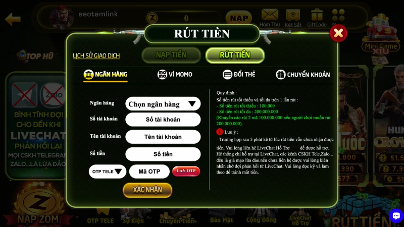 Người chơi chọn phương thức phù hợp để rút tiền Zomclub, chẳng hạn như ngân hàng hoặc ví điện tử. Sau đó nhập thông tin thanh toán theo yêu cầu của hệ thống.