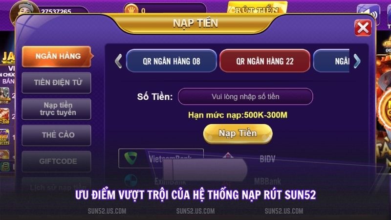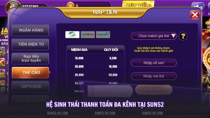 Sun52 hỗ trợ linh hoạt các kênh thanh toán từ Ngân hàng, Ví điện tử đến Thẻ cào, mang đến sự tiện lợi tối đa cho người chơi